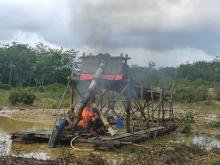 Personil Sat Reskrim Polres Kuansing dan Polsek Kuantan Hilir Musnahkan Dua Unit Rakit PETI Di Desa
