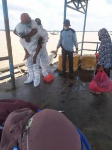 PEKANBARU - Pasien suspek Covid-19 digendong petugas dengan menyebrangi sungai di Indragiri Hilir, -