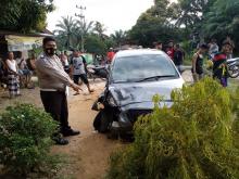 Gara-Gara Pecah Ban, Mobil Datsun Tabrak Pemotor Dijalan Raya Desa Batu Langka Kecil