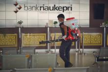 Cegah Penyebaran Covid-19, Bank Riau Kepri Disemprot Cairan Disinfektan