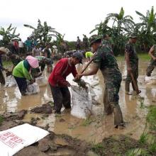 Aparat gabungan TNI Koramil 19/Gabus, POLRI bersama warga berjibaku menambal tanggul yang jebol