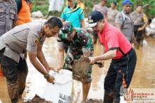 Aparat gabungan TNI Koramil 19/Gabus, POLRI bersama warga berjibaku menambal tanggul yang jebol